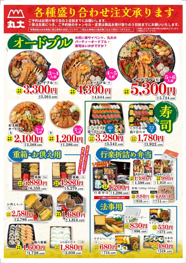 惣菜コーナーにて各種盛合せの注文承っております。
