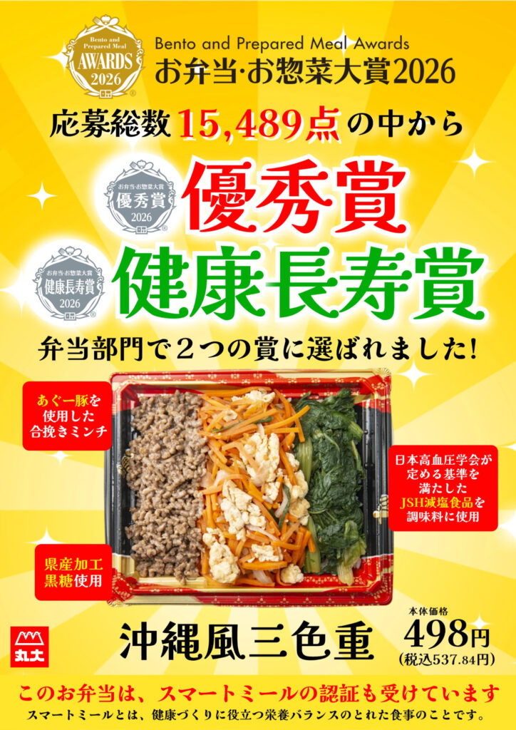 お弁当お惣菜大賞2026において優秀賞と健康長寿賞をダブル受賞した沖縄風三色重をぜひお試し下さい!